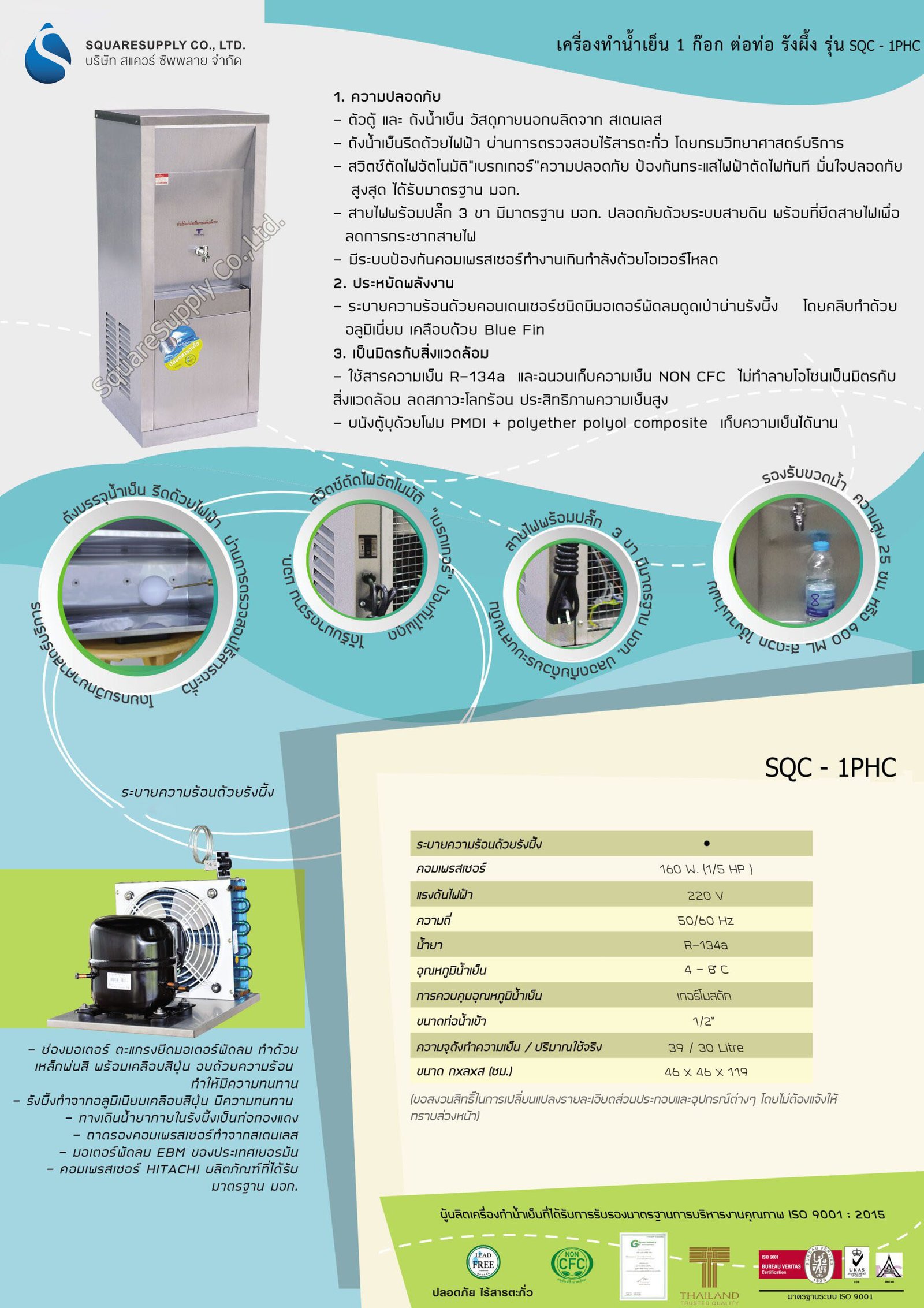 ระบายความร้อนด้วยรังผึ้ง• คอมเพรสเซอร์ : 160 W. (1/5 HP)• แรงดันไฟฟ้า : 220 V• อุณหภูมิน้ำเย็น : 4 – 8 องศา• การควบคุมอุณหภูมิน้ำเย็น : เทอร์โมสตัท• ความจุถังทำความเย็น / ปริมาณใช้จริง : 39 / 30 Litre• ขนาด กxลxส (ซม.) : 46 x 46 x 119