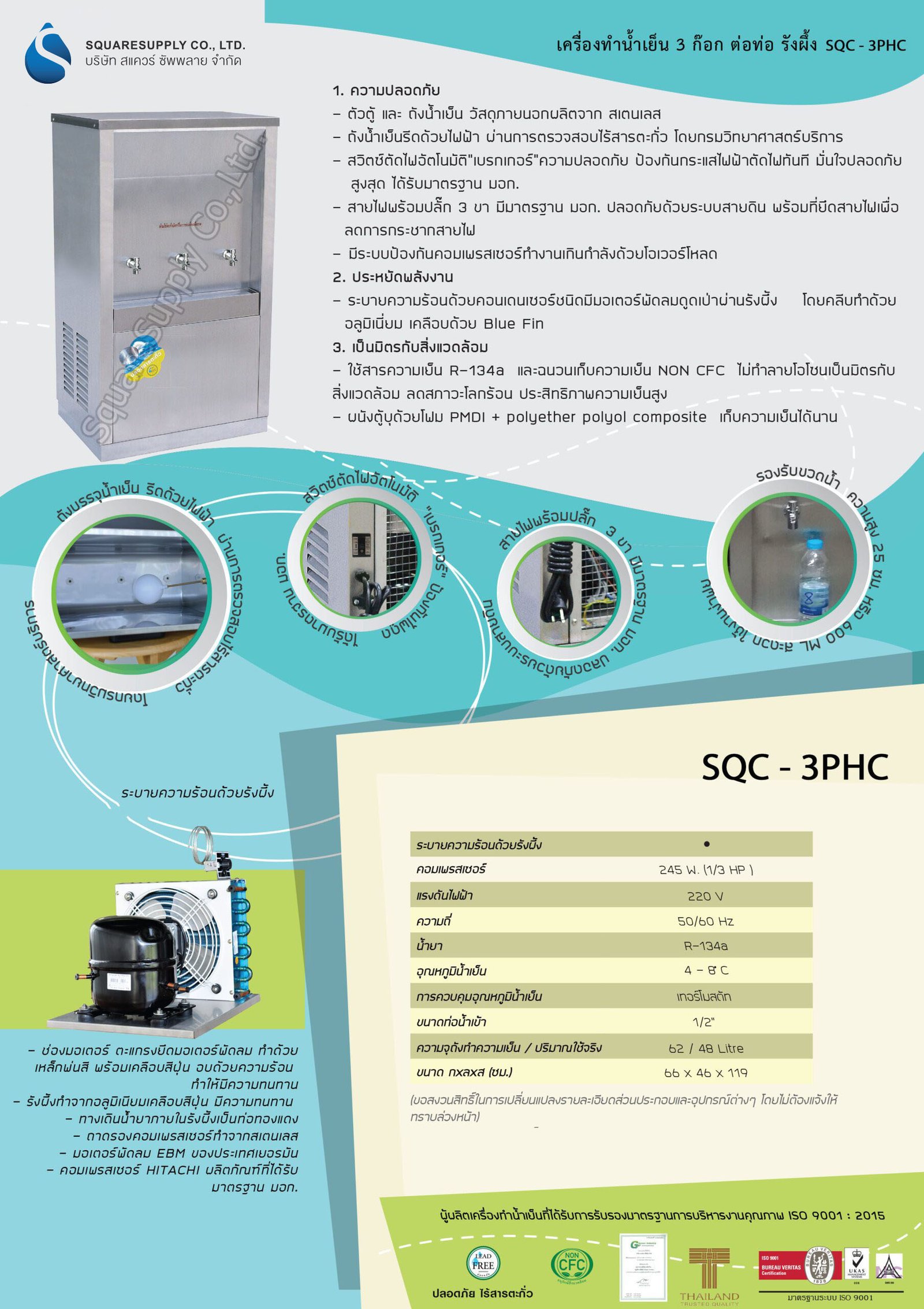 ระบายความร้อนด้วยรังผึ้ง• คอมเพรสเซอร์ : 245 W. (1/3 HP)• แรงดันไฟฟ้า : 220 V• อุณหภูมิน้ำเย็น : 4 – 8 องศา• การควบคุมอุณหภูมิน้ำเย็น : เทอร์โมสตัท• ความจุถังทำความเย็น / ปริมาณใช้จริง : 62 / 48 Litre• ขนาด กxลxส (ซม.) : 66 x 46 x 119