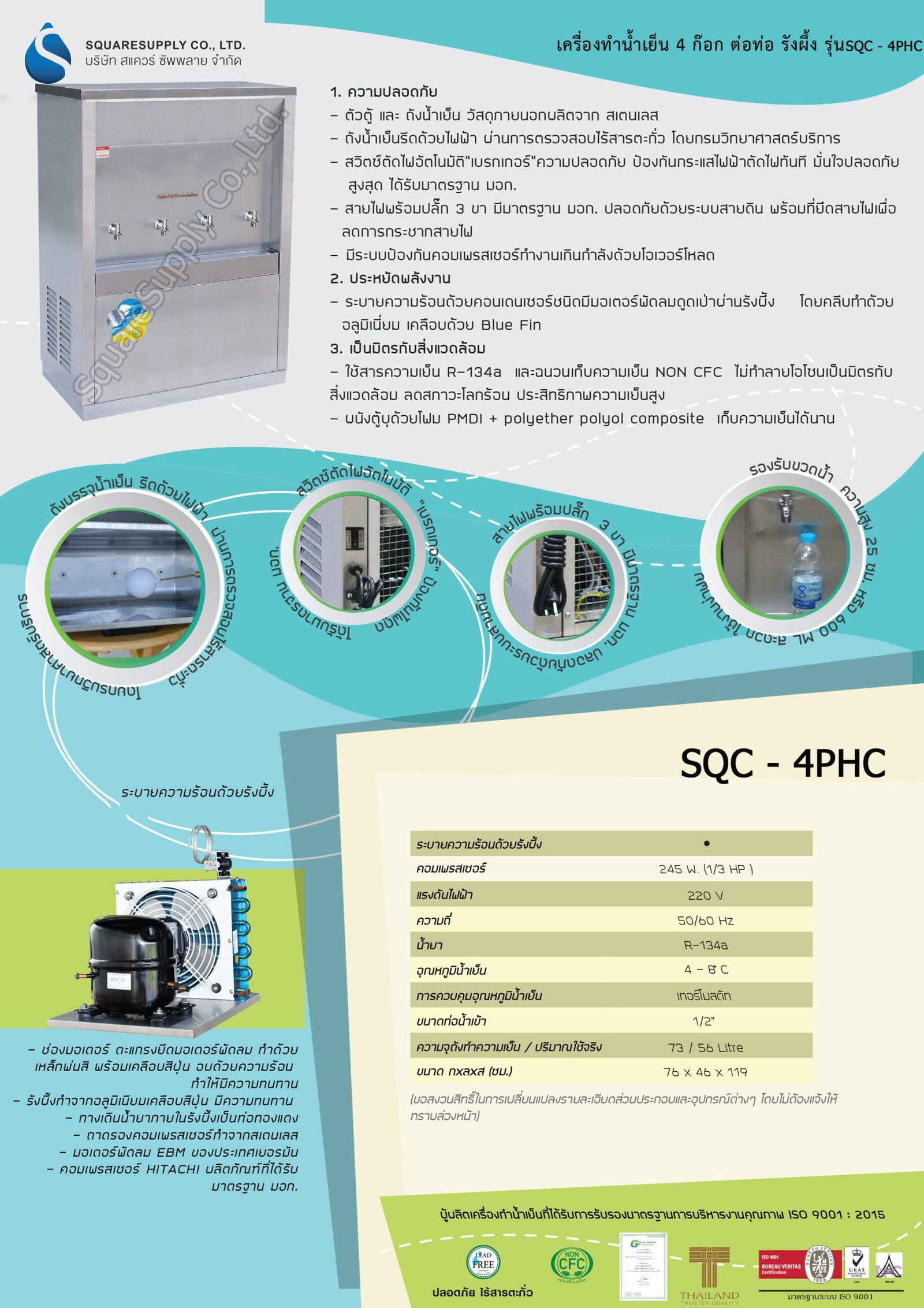 ระบายความร้อนด้วยรังผึ้ง• คอมเพรสเซอร์ : 245 W. (1/3 HP)• แรงดันไฟฟ้า : 220 V• อุณหภูมิน้ำเย็น : 4 – 8 องศา• การควบคุมอุณหภูมิน้ำเย็น : เทอร์โมสตัท• ความจุถังทำความเย็น / ปริมาณใช้จริง : 73 / 56 Litre• ขนาด กxลxส (ซม.) : 76 x 46 x 119