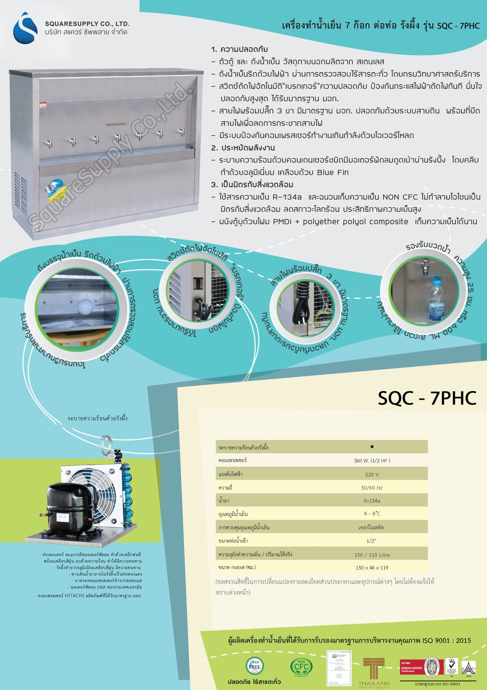 ระบายความร้อนด้วยรังผึ้ง• คอมเพรสเซอร์ : 360 W. (1/2 HP)• แรงดันไฟฟ้า : 220 V• อุณหภูมิน้ำเย็น : 4 – 8 องศา• การควบคุมอุณหภูมิน้ำเย็น : เทอร์โมสตัท• ความจุถังทำความเย็น / ปริมาณใช้จริง : 150 / 115 Litre• ขนาด กxลxส (ซม.) : 150 x 46 x 119