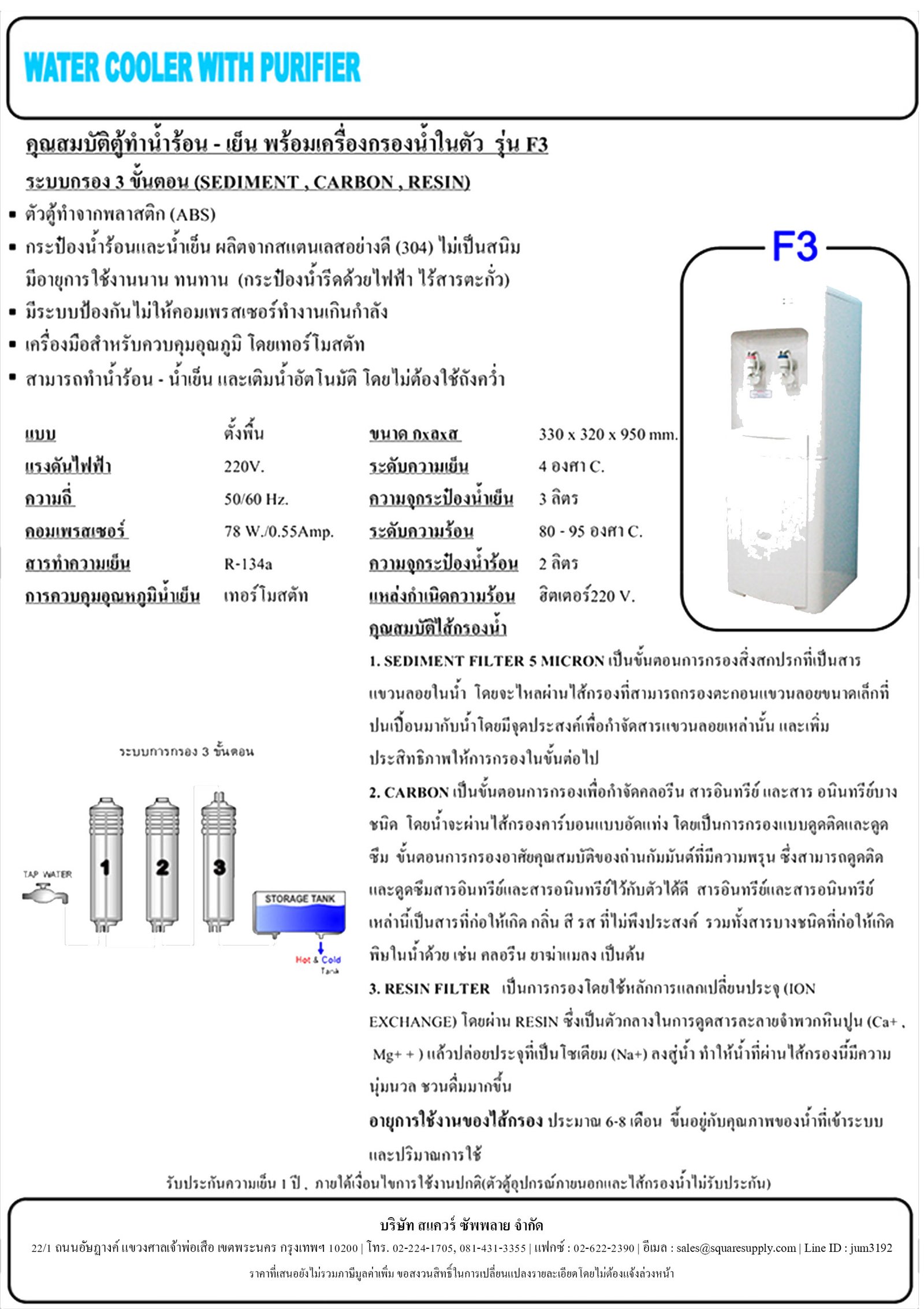 ตู้น้ำเย็น 1 ก๊อก, น้ำร้อน 1 ก๊อก รุ่น SQC-F3-3Fil (N)